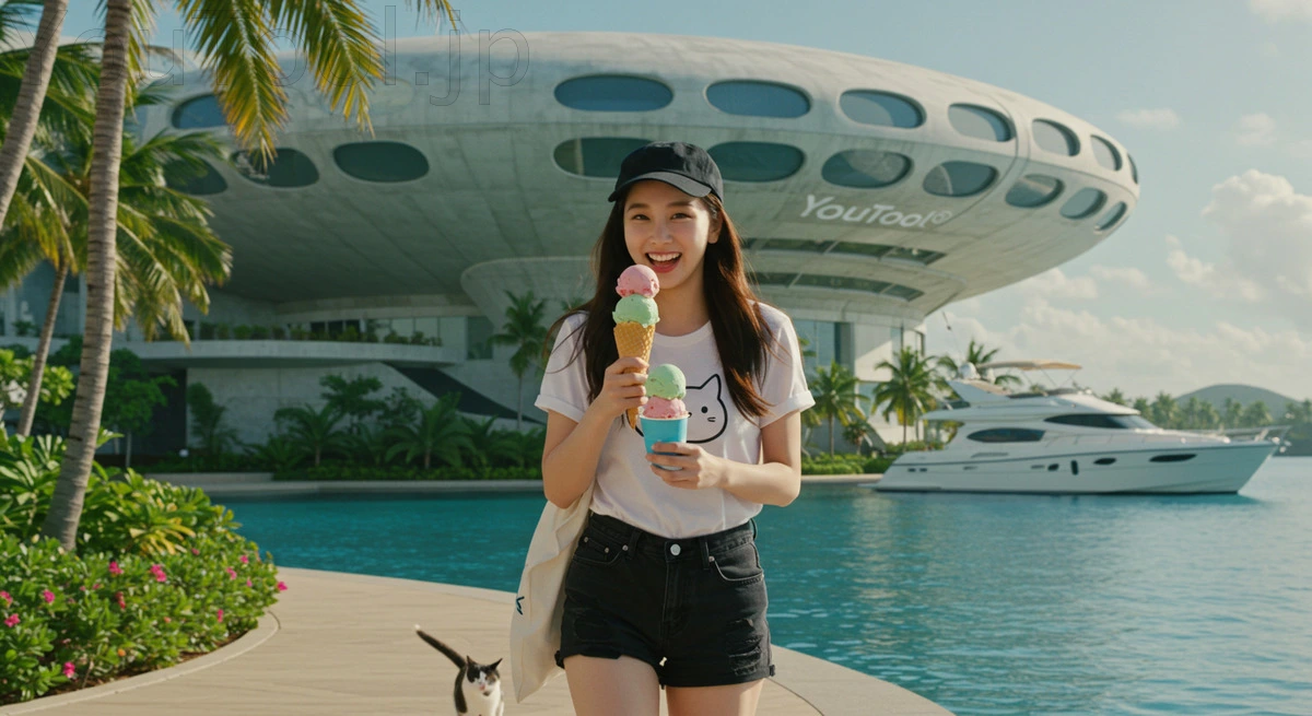 円形のホテル、海辺を歩く女、その脇のクルーザー